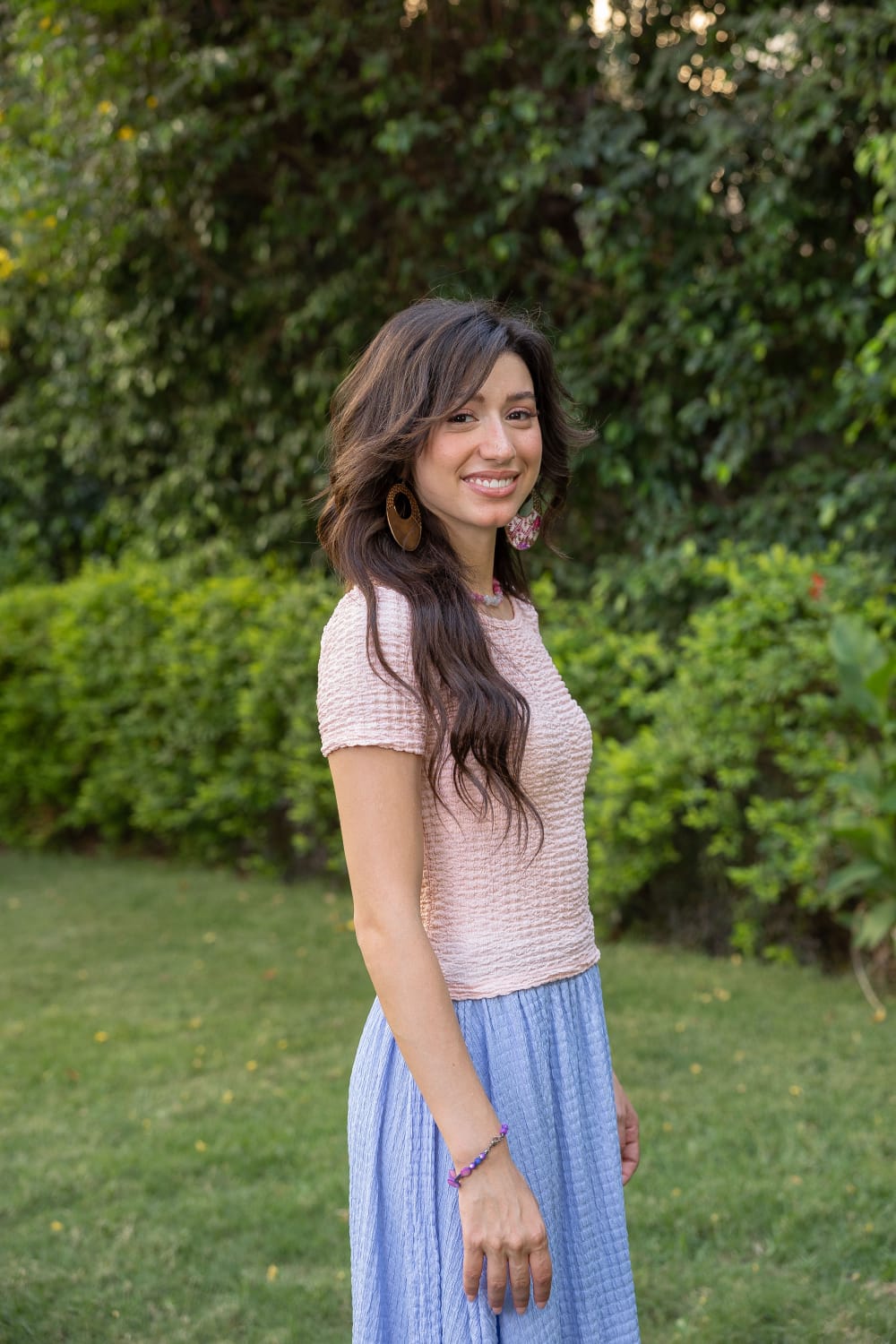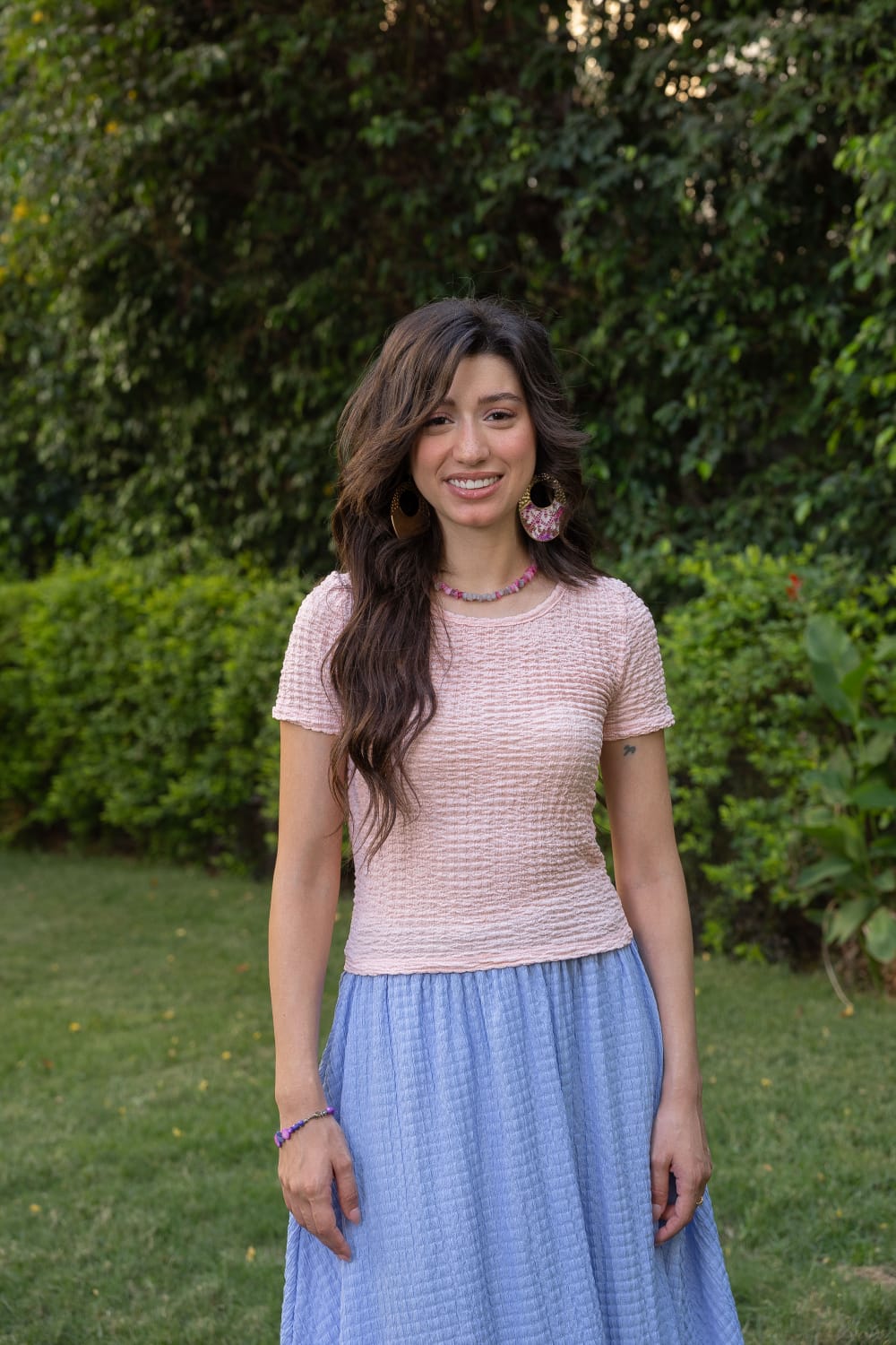 Short-sleeved, thin, bubblegum-print blouse with a round neckline