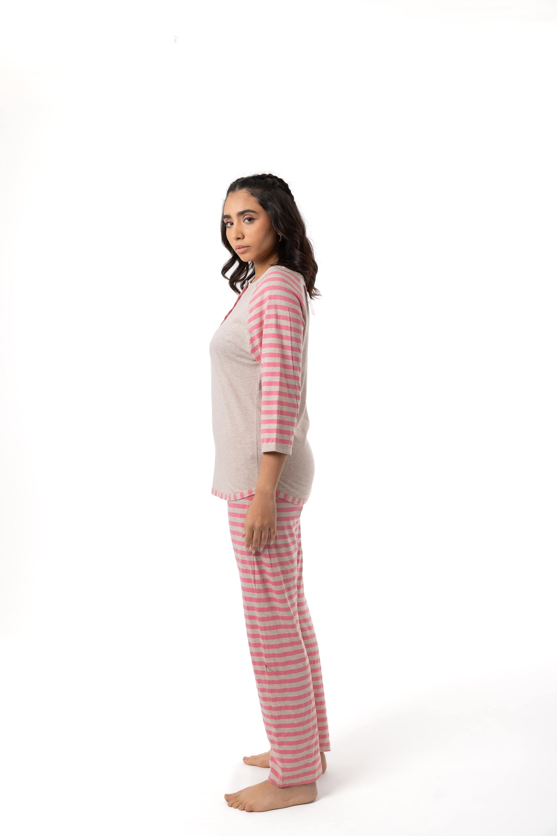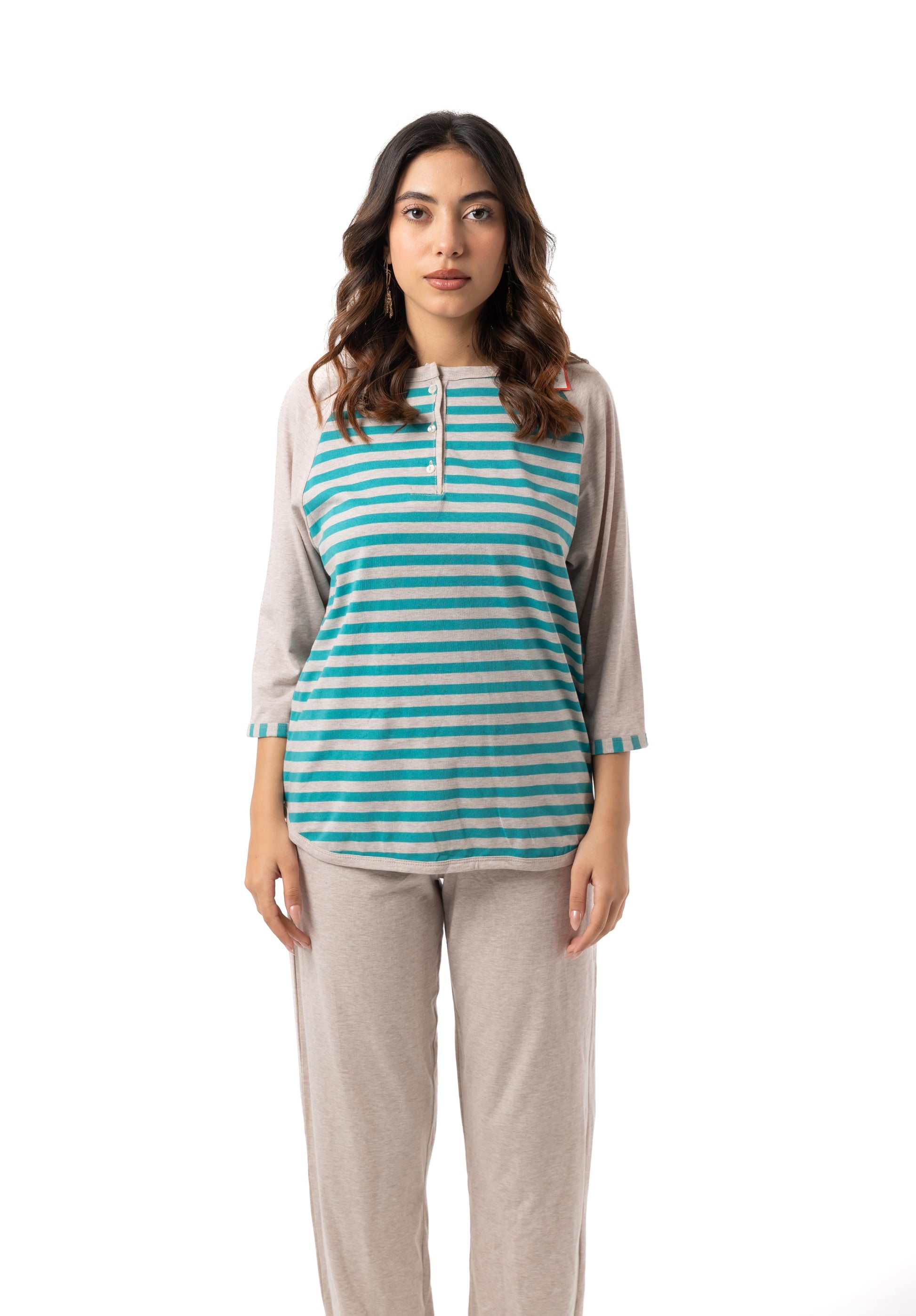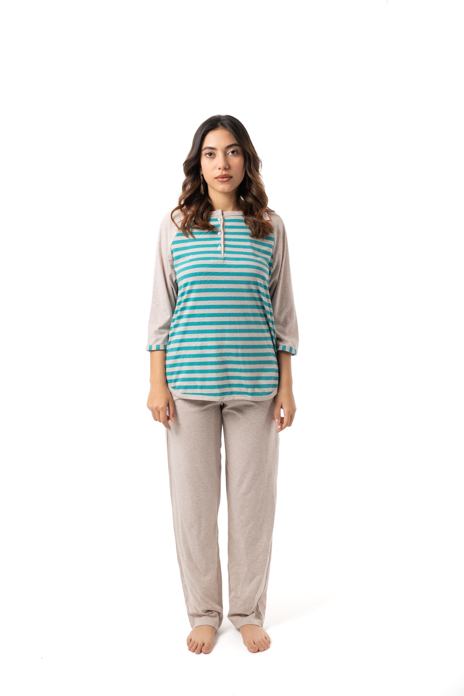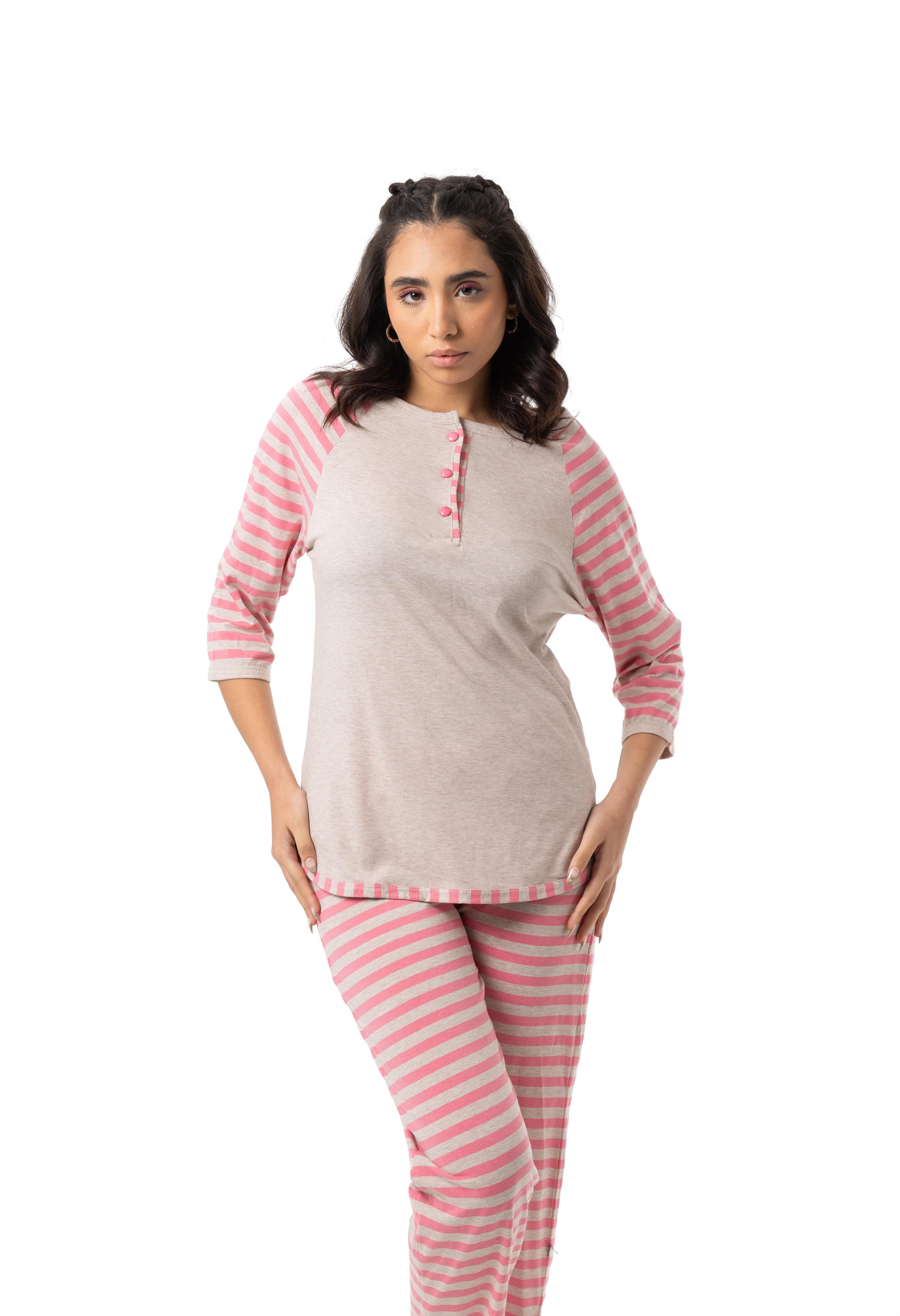 استمتعي بالراحة والأناقة مع طقم البيجامة دريمي كومفورت. تصميم مثالي للنوم المريح والاسترخاء طوال اليوم، بيتميز بتوب واسع بأكمام طويلة ومخطط أنيق مع بنطلون سادة مريح. خامة قطن-بوليستر ناعمة وخفيفة على البشرة، هتخليكِ تحسي براحة لا تقاوم!