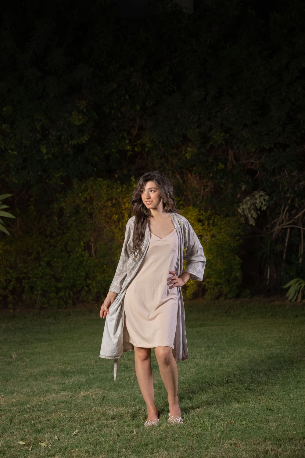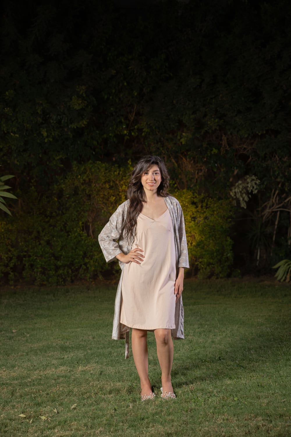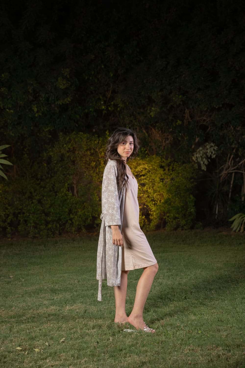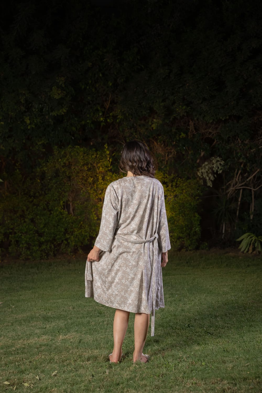 Home set, a shirt and a soft robe, made of natural cotton. The shirt is plain and the robe is printed with roses and has a belt
