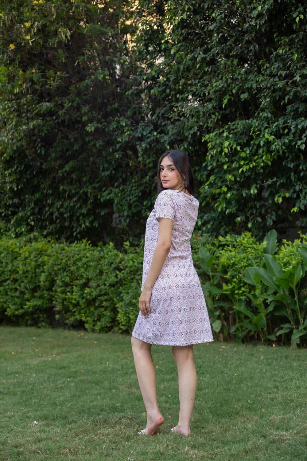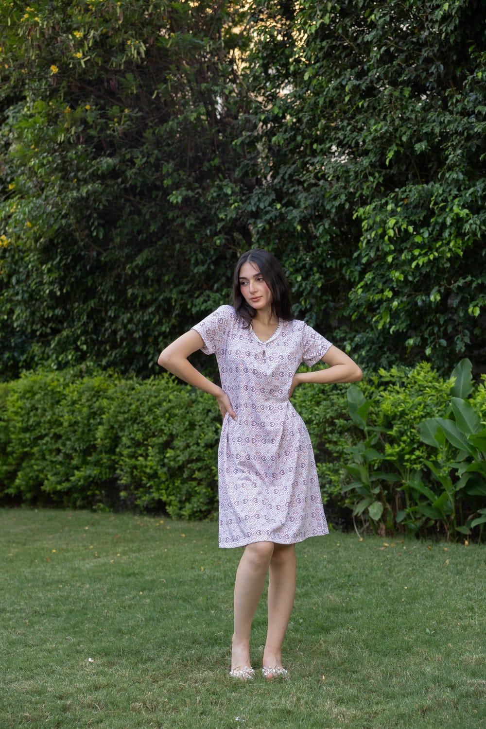A soft, short-sleeved home shirt made of pure cotton with delicate white lace on the neck and sleeves
