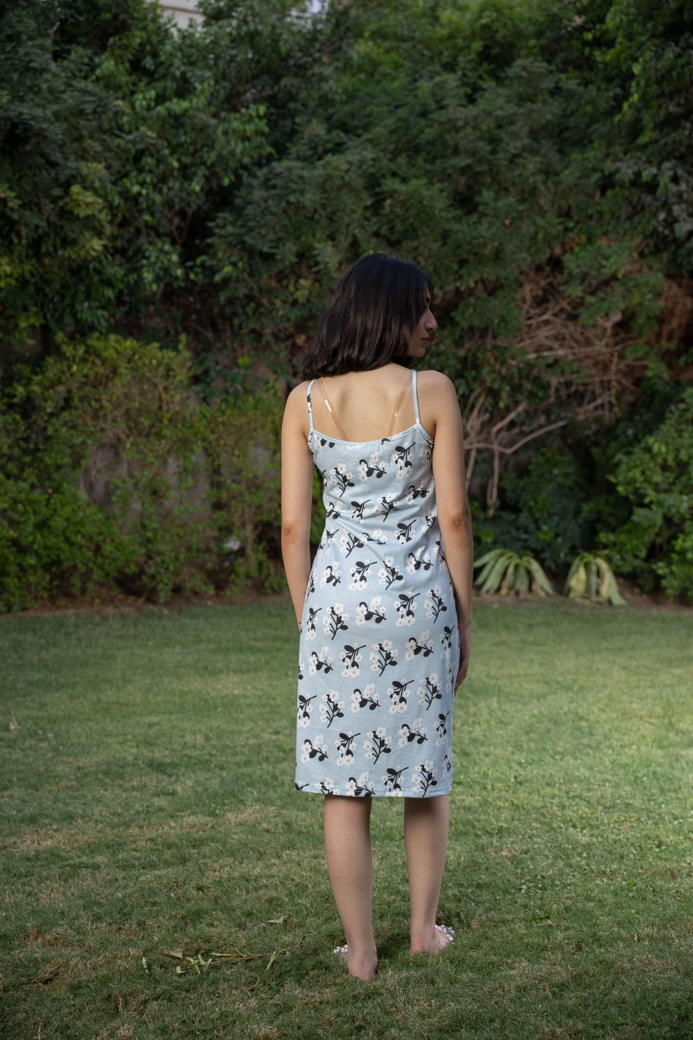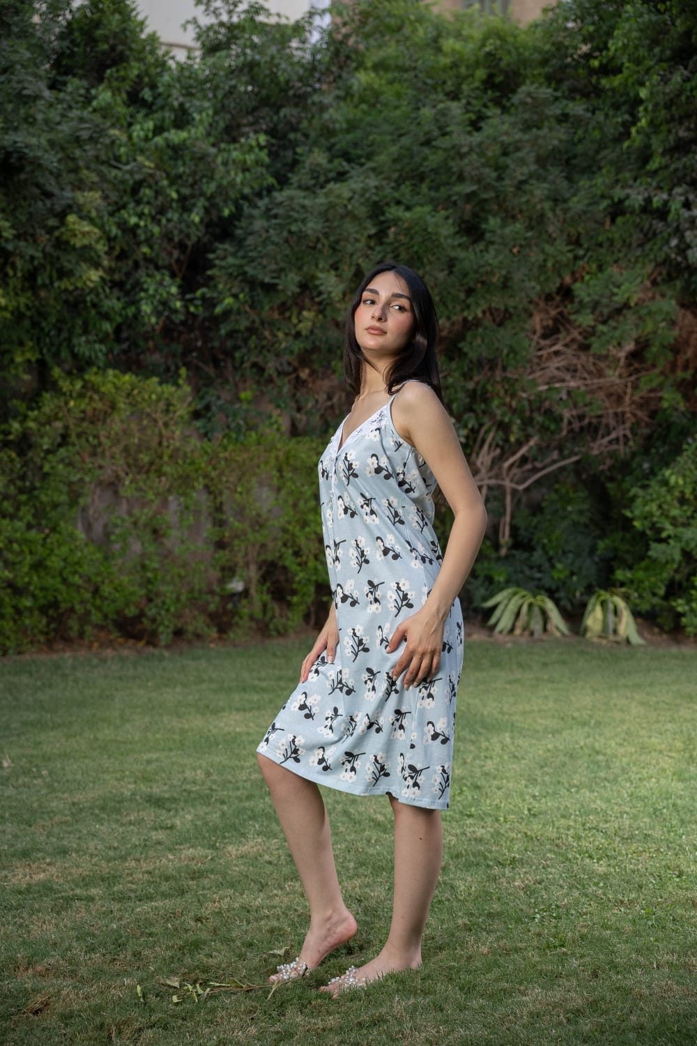 Soft cotton cami with delicate print and delicate white lace on the chest and neckline