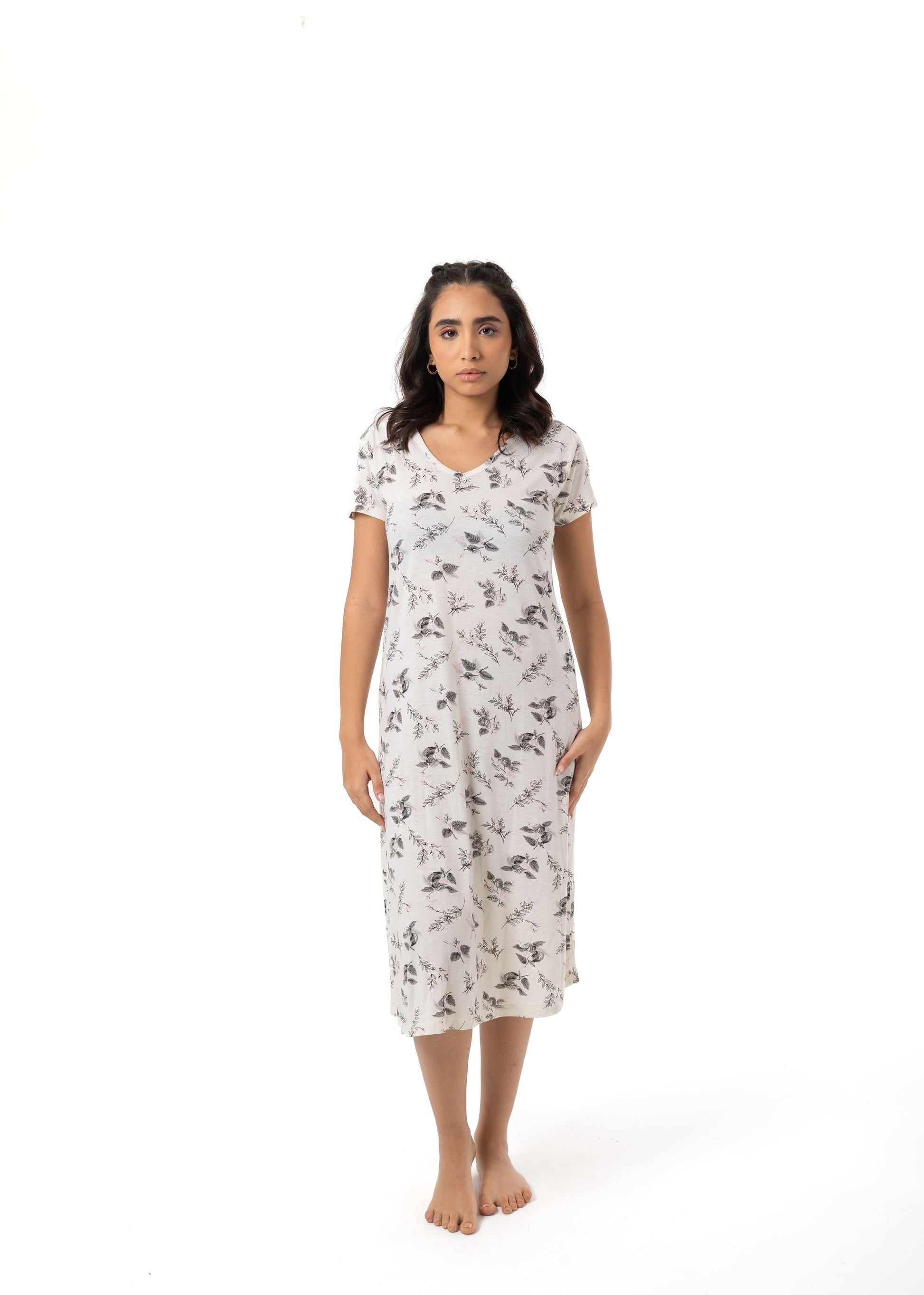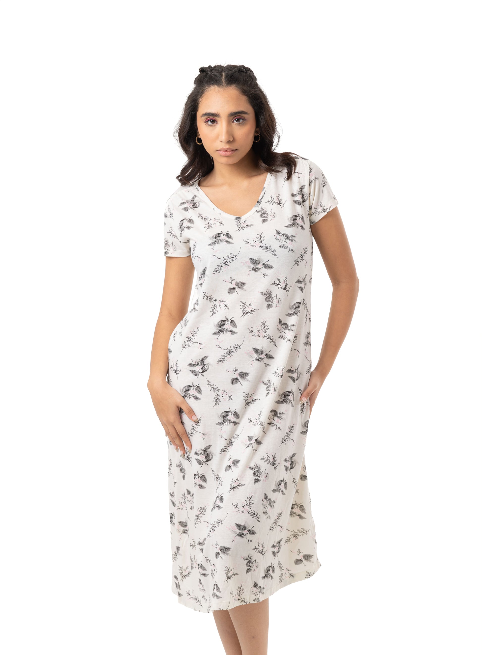 استمتعي بنوم مريح مع قميص النوم القطني 100% بنقشة الورق، المصمم علشان يحسسك بالراحة والتهوية الحلوة والأناقة. القماش ناعم وخفيف، يخليكِ مرتاحة طول الليل، والنقشة المستوحاة من الطبيعة بتدي لمسة أنثوية شيك.