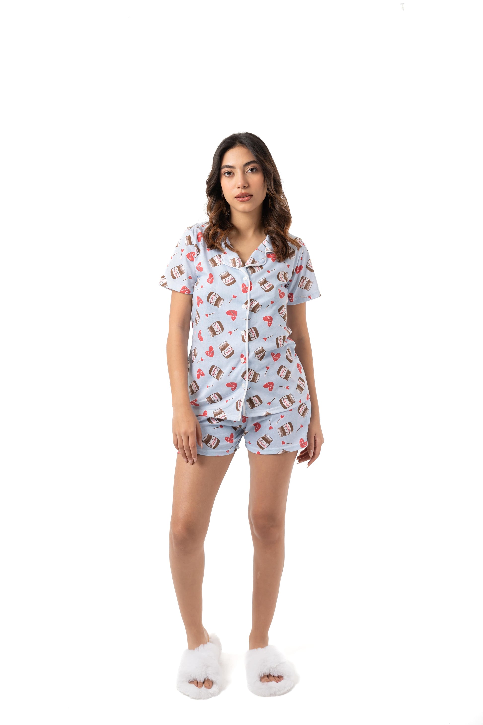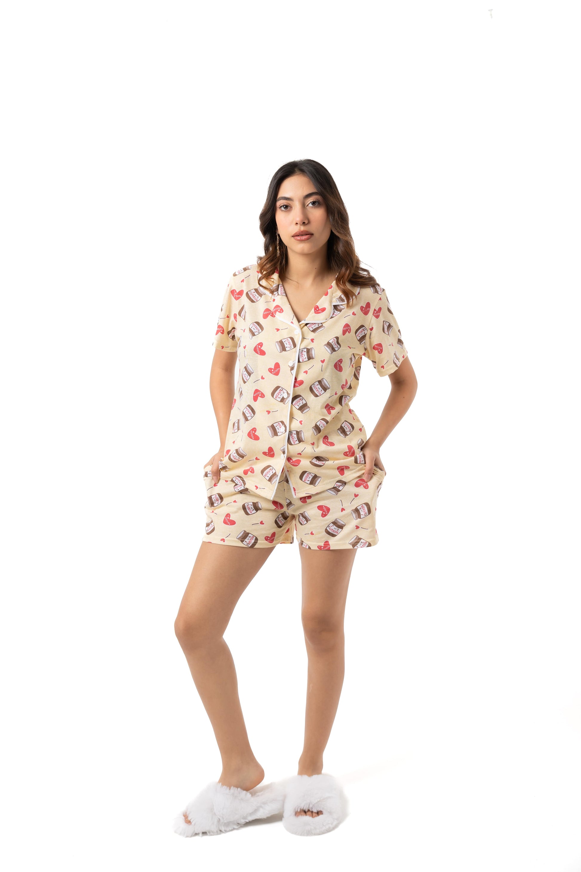 استمتعي بالراحة مع طقم بيچاما نوتيلا المصمم للاسترخاء بكل أناقة. مزين بطبعات برطمان نوتيلا وقلوب لطيفة، ويشمل قميص نص كم بأزرار وياقة كلاسيكية مع شورت بوسط مطاطي لراحة مثالية طول اليوم.