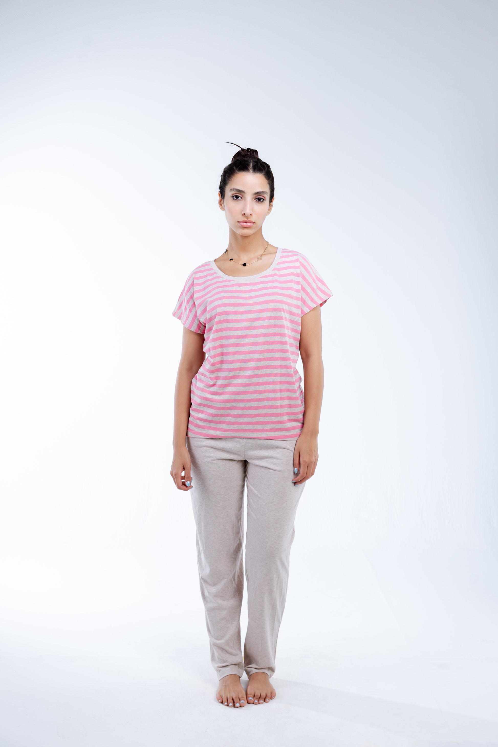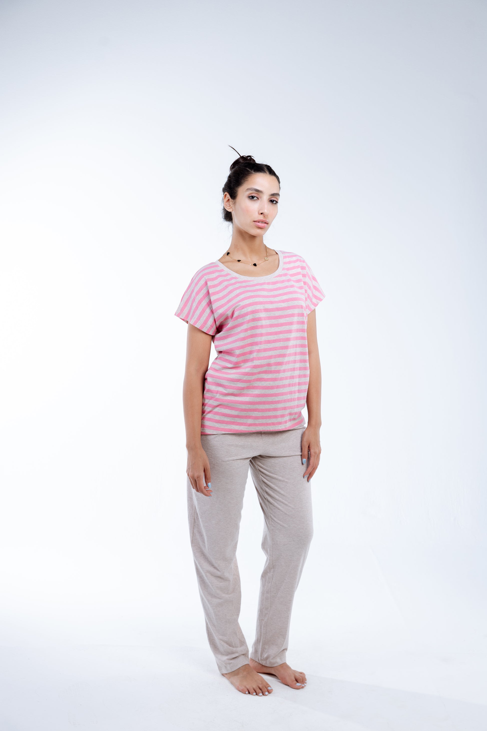 بنطلون بيجاما وتيشيرت. البنطلون سادة، والتيشيرت مخطط، مصنوع من القطن والبوليستر. البنطلون فضفاض وجيوب. التيشيرت نصف كم وياقة دائرية. البيجاما مريحة وناعمة لفصل الصيف. مصنوعة من ٥٠٪ قطن و٥٠٪ بوليستر.