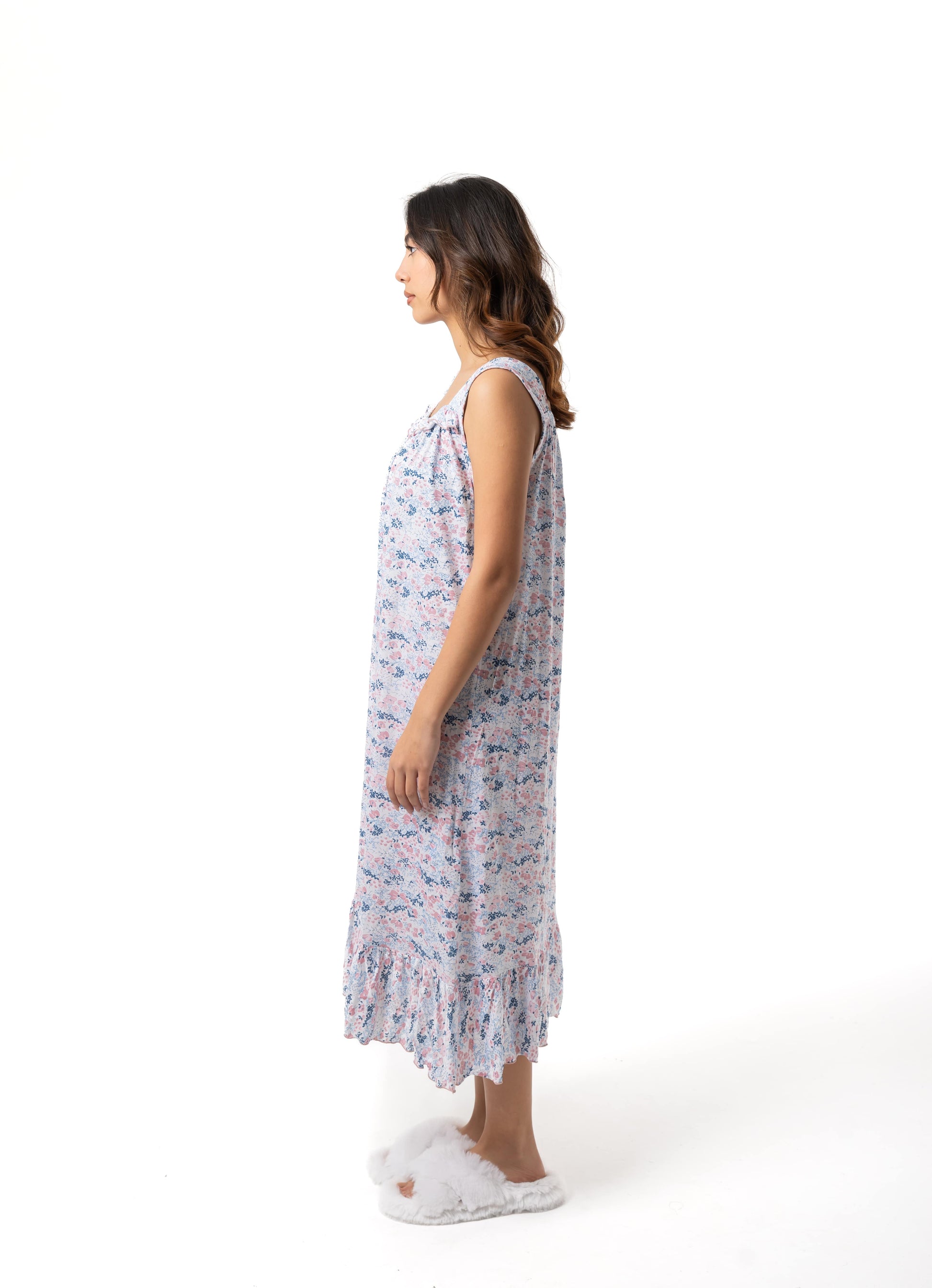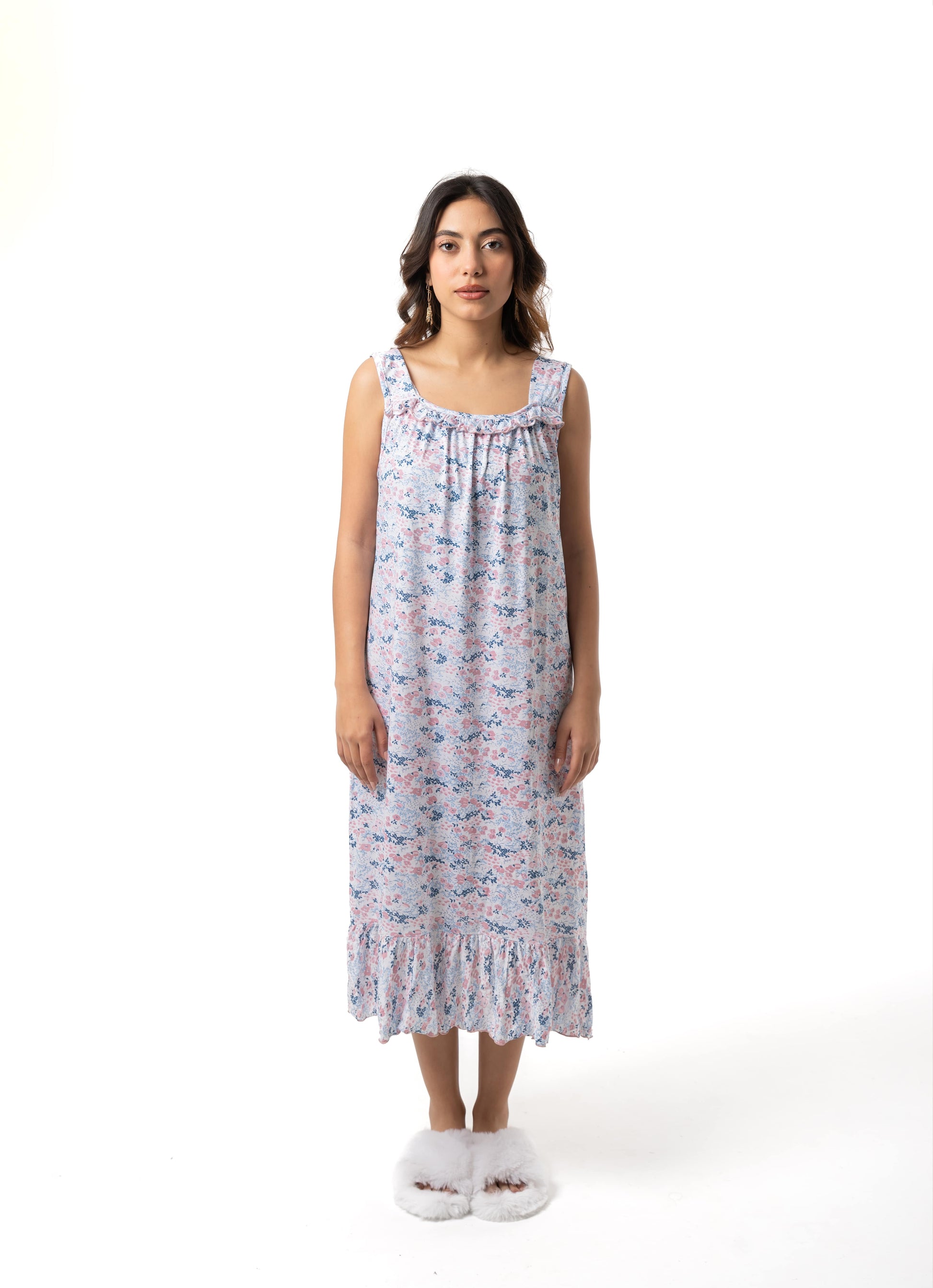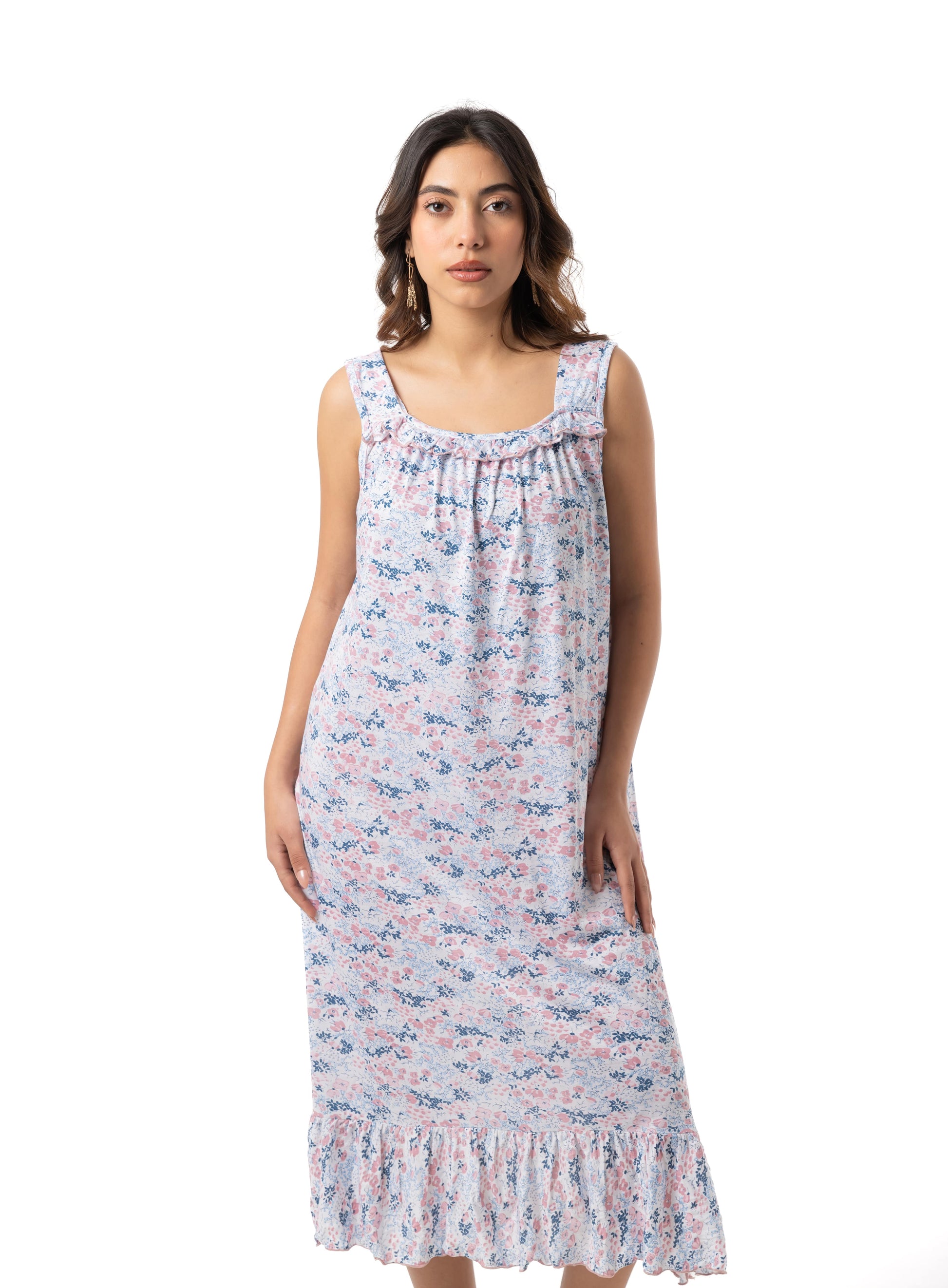 استمتعي بالراحة مع قميص النوم بطبعة مع كشكشة، المصمم للاسترخاء بكل سهولة. مصنوع من مزيج 95% فيسكون، 5% ليكرا ليمنحك ملمسًا ناعمًا وخفيفًا مع مرونة لطيفة لراحة لا مثيل لها. يتميز بتصميم بدون أكمام، ياقة بكشكشة، وقصة واسعة تضيف لمسة أنثوية، مما يجعله مثاليًا للاسترخاء أو النوم بأناقة.