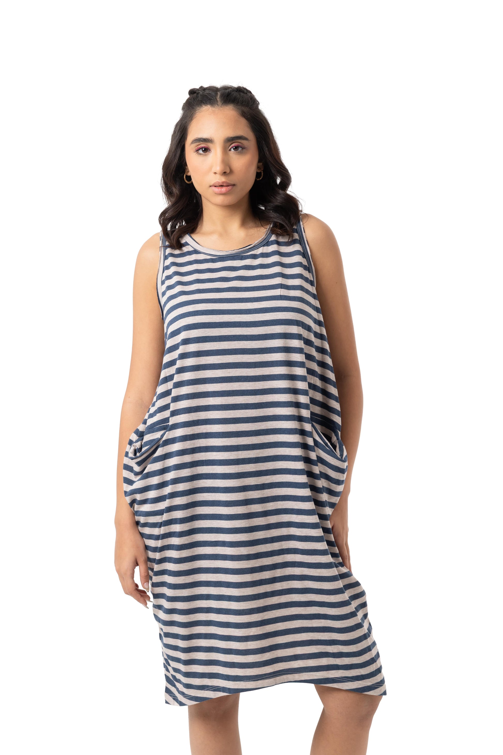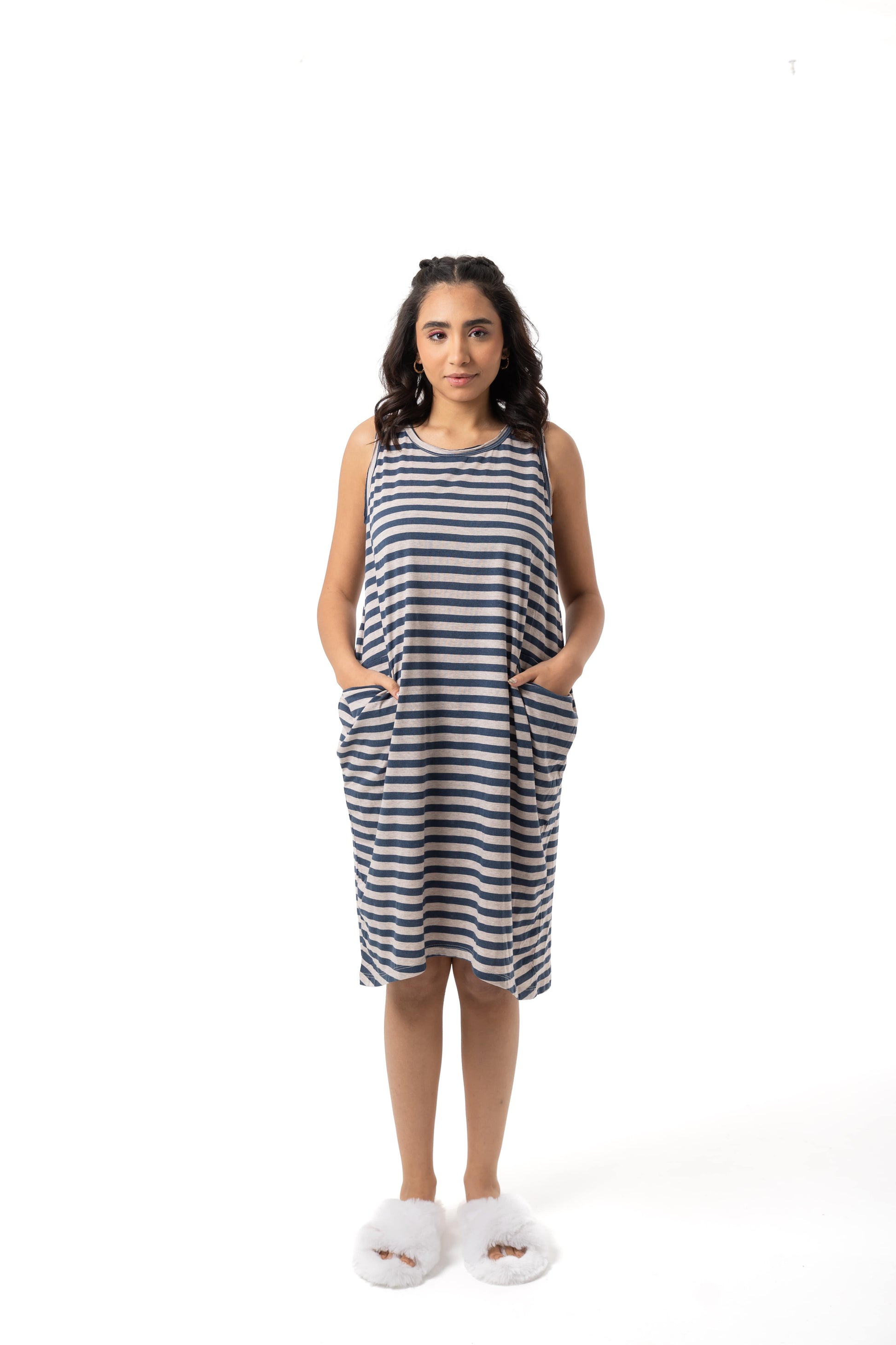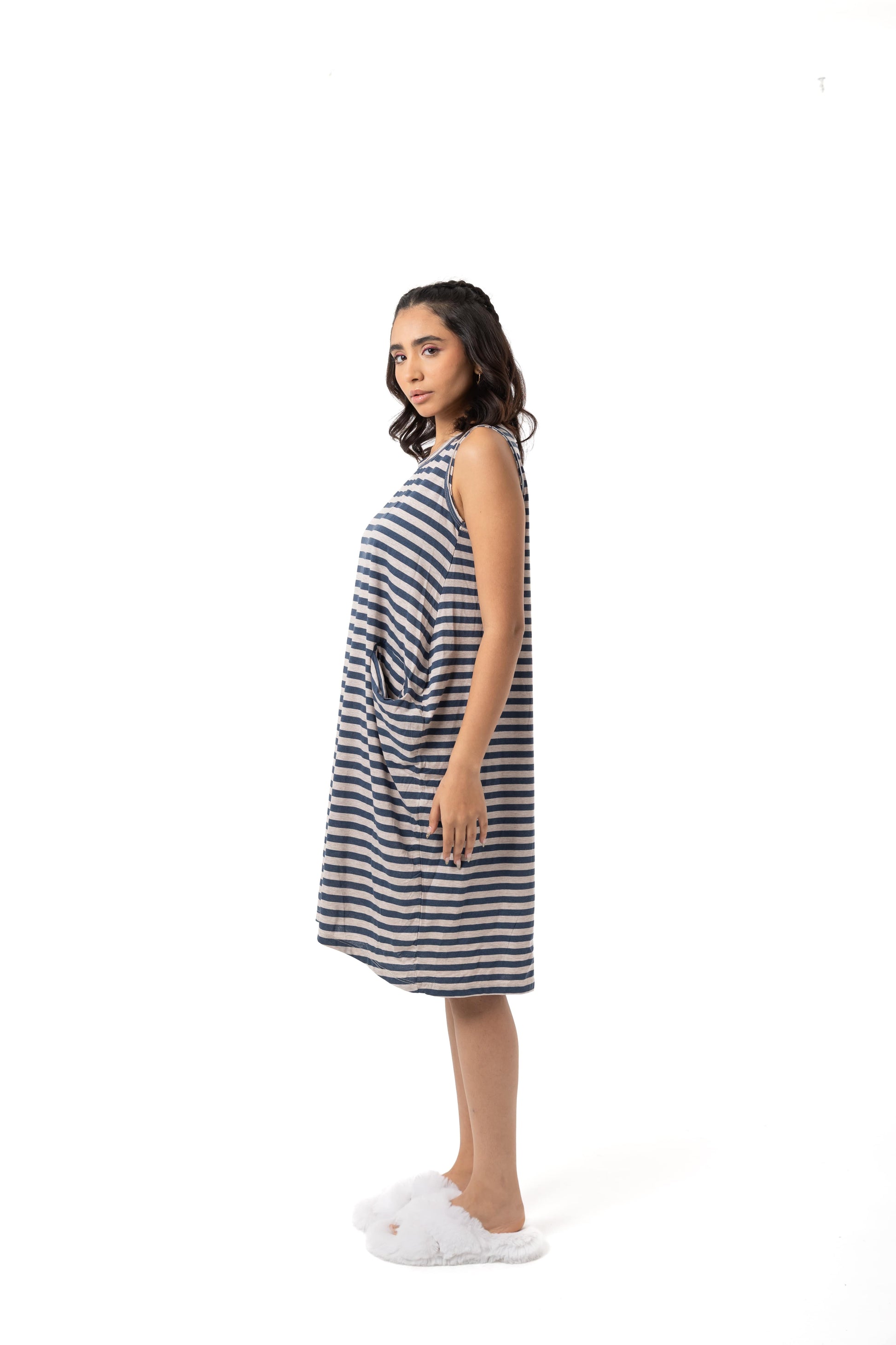 استمتعي بالراحة مع فستان البيجاما المقلم بدون أكمام، المصمم للاسترخاء بكل سهولة. مصنوع من 50% قطن و50% بوليستر لمزيج مثالي من النعومة والتهوية والمتانة، مما يضمن لك نومًا هادئًا. يتميز بقصة واسعة ومريحة، وفتحات ذراع واسعة، وجيوب جانبية عملية، ليجمع بين الأناقة والراحة في آنٍ واحد. سواء كنتِ تستعدين للنوم أو تسترخين في المنزل، فهذه البيجاما هي خيارك المثالي للراحة اليومية.