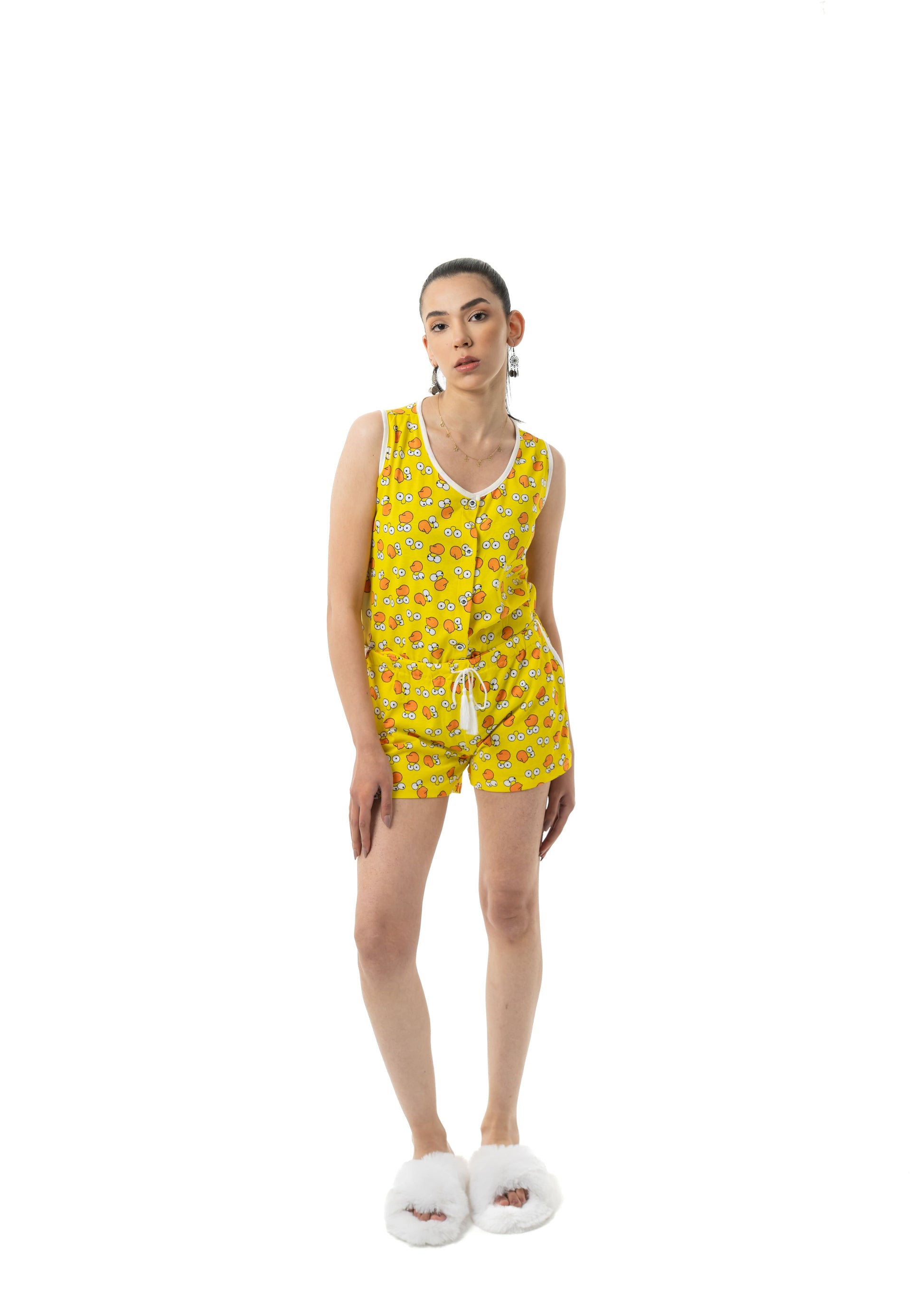 استمتعي بالراحة طوال الليل مع طقم البيجامة الأصفر المطبوع المصنوع من 100% قطن ناعم وقابل للتنفس. صُمم هذا الطقم للاستمتاع بلحظات الاسترخاء والنوم المريح، حيث يتميز بتوب بدون أكمام برقبة دائرية وأزرار أمامية لإطلالة كاجوال أنيقة. يأتي مع شورت مريح بخصر مطاطي لضمان ملاءمة مثالية وراحة إضافية. الطباعة الصفراء المبهجة تضيف لمسة منعشة وحيوية لمجموعة ملابسك المنزلية.
