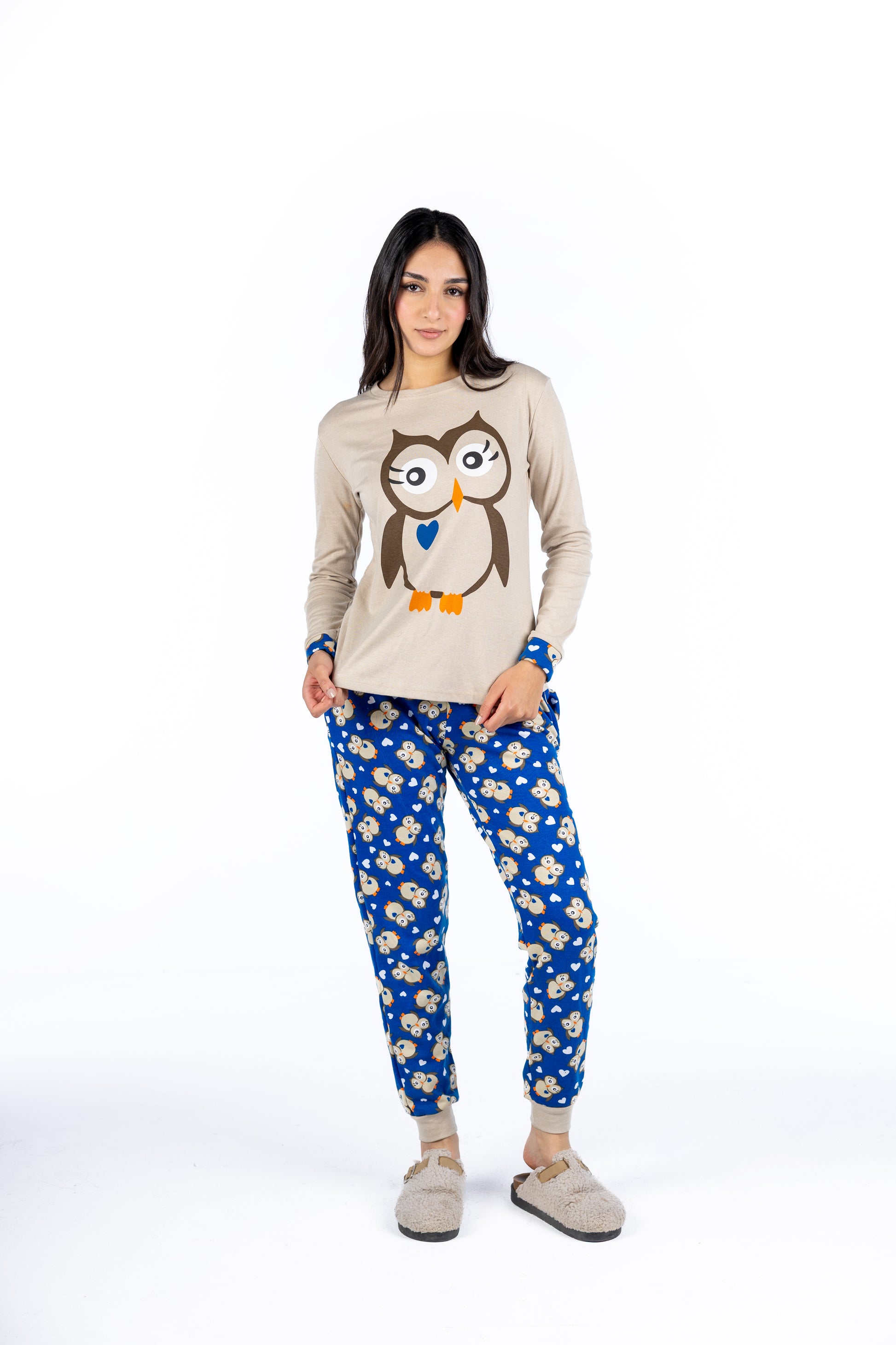 Winter pajama set: pants and t-shirt. The pajama pants are made of soft cotton and feature an owl print; the t-shirt also has an image of an owl.