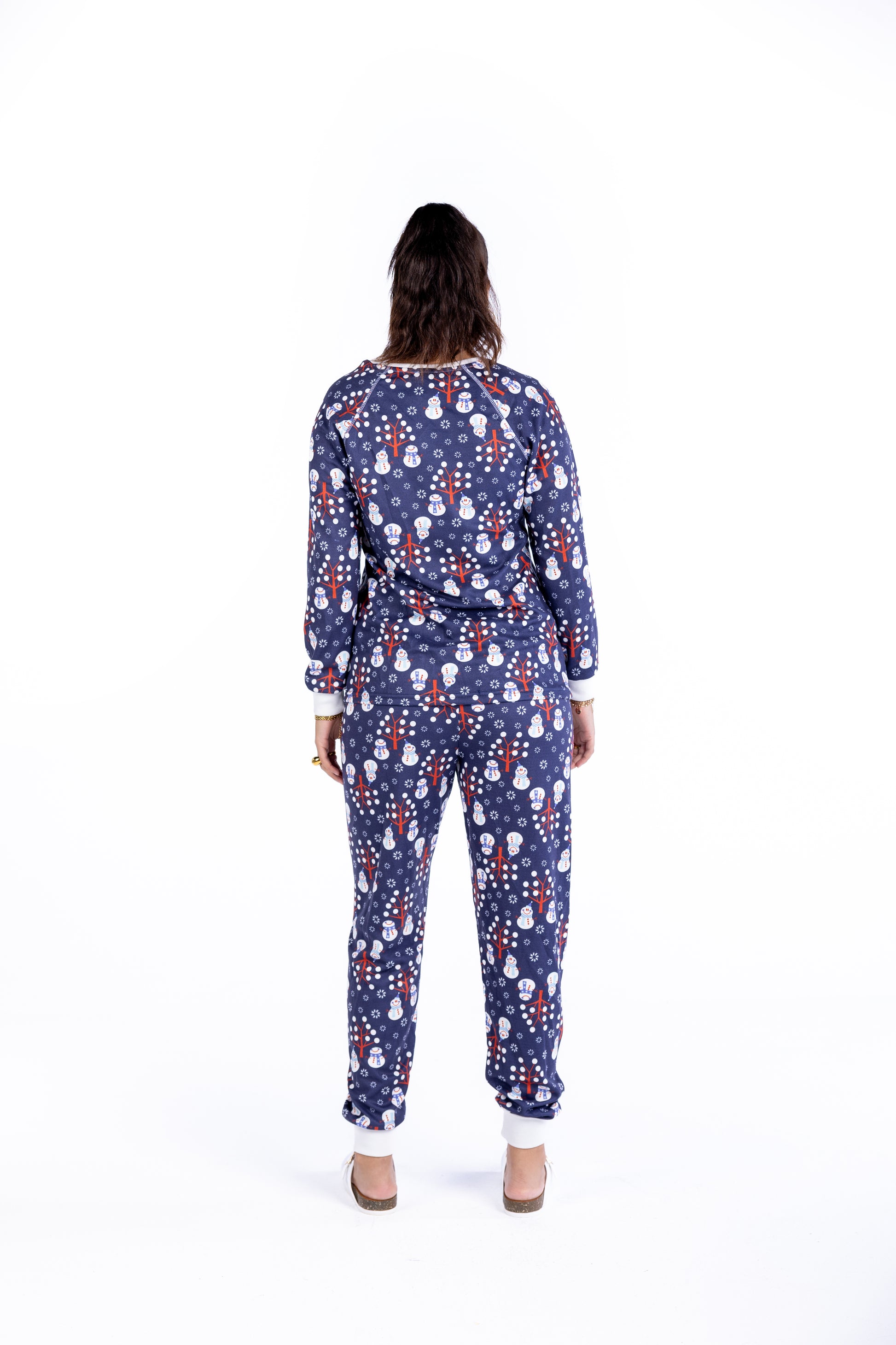 Winter pajama set (pants and sweatshirt). The pajamas are made of soft polyester and feature a snowman design, making them perfect for Christmas and New Year's celebrations.